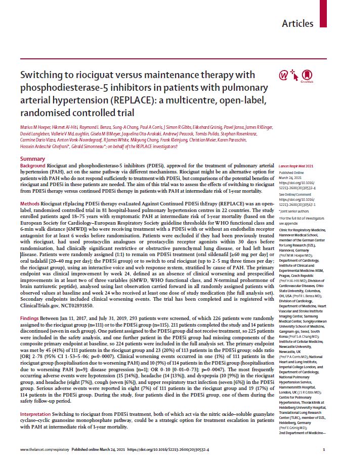Clinical data indicate that 20–60% of patients with PAHPAH, pulmonary arterial hypertension receiving PDE5iPDE5i: phosphodiesterase type 5 inhibitor do not reach or maintain treatment goals. Switching to riociguat may be a treatment option for these patients. The REPLACE study investigated the efficacy and safety of switching from PDE5iPDE5i: phosphodiesterase type 5 inhibitor to riociguat compared with remaining on PDE5iPDE5i: phosphodiesterase type 5 inhibitor in patients with PAHPAH, pulmonary arterial hypertension at intermediate risk.
